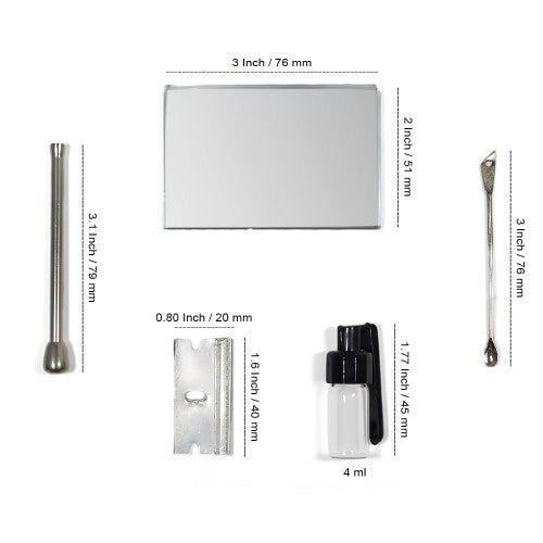 - 5 piece set with Snuff Bottle, Snorting tube, Razor Blade, Spoon, Pocket Mirror.